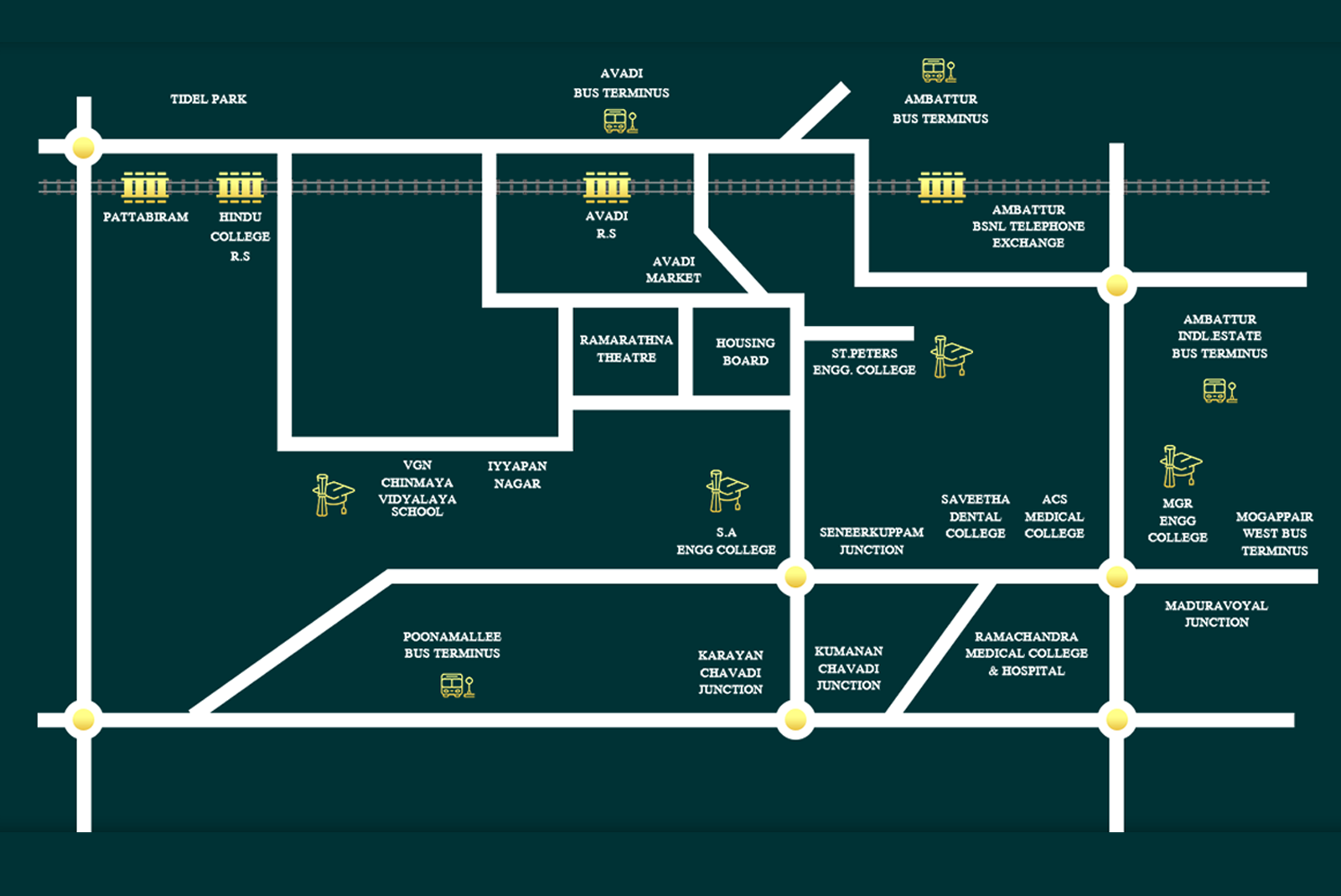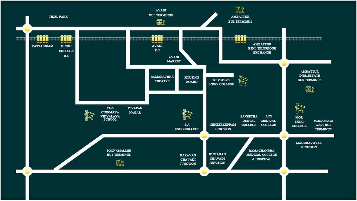 As an established defense hub and emerging IT valley, Avadi offers promising land investment opportunities due to its evolving infrastructure and transportation facilities. The locale's growth is supported by industrial parks and upcoming IT offices. Excellent connectivity is provided by Avadi-Poonamallee Road, allowing easy access to Pattabiram, Thirumullaivoyal via NH716, Ambattur, Ayapakkam via Ambattur Road, and Chennai's city center via Poonamallee High Road.